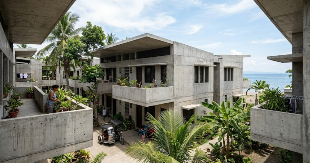 • Tropical Brutalism: Combines raw materiality with climate-responsive design