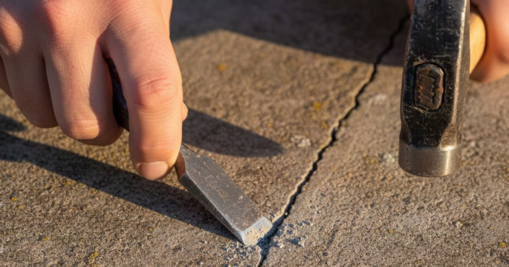 For very fine cracks, it can be hard to get the filler inside. You can use a hammer and a small masonry chisel to slightly “V” out the crack. This gives the repair material more surface area to grab onto.